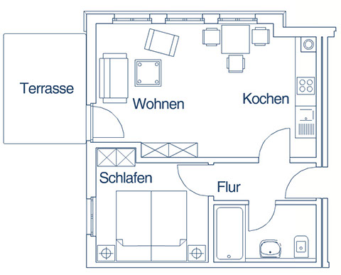 Küchenzeile, 1 Schlafraum, 1 Bad mit Dusche oder